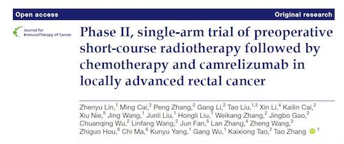 2021年11月1日,一项由华中科技大学同济医学院附属协和医院肿瘤中心张涛教授和陶凯雄教授团队召开的“短程放疗(SCRT)序贯卡瑞利珠单抗联合CAPOX新辅助治疗后延迟手术治疗局部晚期直肠癌(LARC)的单臂II期研究(NCT04231552)”成果在The Journal for ImmunoTherapy of Cancer上全文发表。该杂志是肿瘤免疫治疗学会的官方期刊,2018年IF为8.728分,在158本免疫学SCI期刊中排名第12,2021年IF已升至13.751分。
