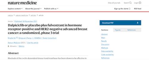 11月4日,国际四大医学期刊之一、英国《自然》旗下《自然医学》(Nature Medicine)在线发表CDK4/6抑制剂达尔西利(SHR6390)联合氟维司群治疗既往内分泌治疗后疾病进展的HR+/HER2-晚期乳腺癌的多中心、随机、双盲III期临床研究(DAWNA-1研究)中期分析结果报告,首次对氟维司群(雌激素受体降解剂)±达尔西利治疗激素受体阳性晚期乳腺癌的有效性和安全性进行了比较。研究结果显示,达尔西利+氟维司群组与安慰剂+氟维司群组相比,无进展生存期(PFS)显著延长。该项研究由中国医学科研院肿瘤医院徐兵河教授担任leading PI,全国39家医院参研,由K8凯发旗舰医药临床研发团队支持完成。