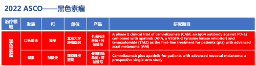 其一为进入2022 ASCO大会口头报告环节郭军教授等召开的单中心、单臂II期研究(NCT04397770),研究采用“双艾”联合注射用替莫唑胺一线治疗晚期肢端黑色素瘤。