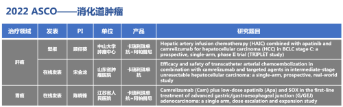 作为壁报接收的1篇是中山大学肿瘤中心顾仰葵教授等召开的TRIPLET研究(NCT04191889)。在线发表的两篇分别是山东省肿瘤医院宋金龙教授等召开的一项经肝动脉栓塞化疗(TACE)联合卡瑞利珠单抗加TKI类靶向药物治疗中期不可切除肝癌的单臂、前瞻性、真实世界研究(ChiCTR2000039508),和江苏省人民医院陈晓锋教授等召开的“双艾”联合化疗一线治疗晚期胃/胃食管结合部癌的单臂、剂量爬坡和扩展研究(ChiCTR2000034109)。其中,TRIPLET研究是一项前瞻性、单臂、Ⅱ期研究,采用“双艾”联合肝动脉灌注化疗(HAIC)治疗BCLC C期肝癌,研究采用Simon两阶段研究设计,研究者曾在ESMO 2021大会作为壁报报告过第一阶段研究结果,扩大患者入组后数据更新,2022 ASCO接收为壁报,期待更新后的疗效数据。