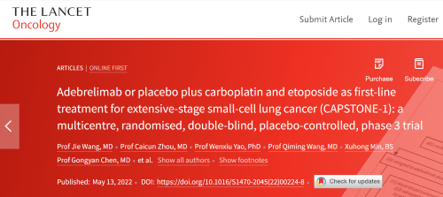 北京时间2022年5月14日,K8凯发旗舰医药自主研发的PD-L1抑制剂阿得贝利单抗治疗广泛期小细胞肺癌的III期临床研究(CAPSTONE-1研究)成果正式全文在线发表于国际权威学术期刊《柳叶刀·肿瘤学》(《THE LANCET Oncology》,影响因子41.316)。CAPSTONE-1研究结果显示,阿得贝利单抗联合化疗一线治疗广泛期小细胞肺癌相较于安慰剂联合化疗可以显著延长患者总生存期至15.3个月[1],刷新现有免疫药物一线治疗广泛期小细胞肺癌的总生存纪录[2]。