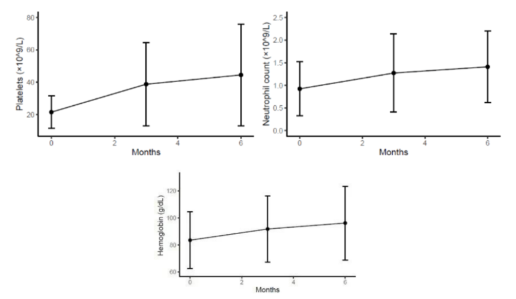 经海曲泊帕和 CsA 治疗 3 个月后,对15 例患者进行随访,总反应率为73.3%(11/15)。取得治疗反应患者的中位PLT和HGB水平分别为35( 22~108)×109/L和92(52~129)g/L。ANC中位值为1.0(0.59~2.85)×109/L。6 个月的总反应率为 66.7%(10/15)。取得治疗反应患者的中位PLT和HGB水平分别为50(23~112)×109/L和104.5(72~135)g/L。ANC中位值为1.56(0.67~3.4 )×109/L。海曲泊帕治疗后,血小板、血红蛋白和中性粒细胞计数显著增加,如图所示。海曲泊帕治疗 6 个月后,8 例 TD-NSAA 患者中有 7 例仍在随访中,其中5 例患者摆脱输血依赖。总反应率为 71.4%。