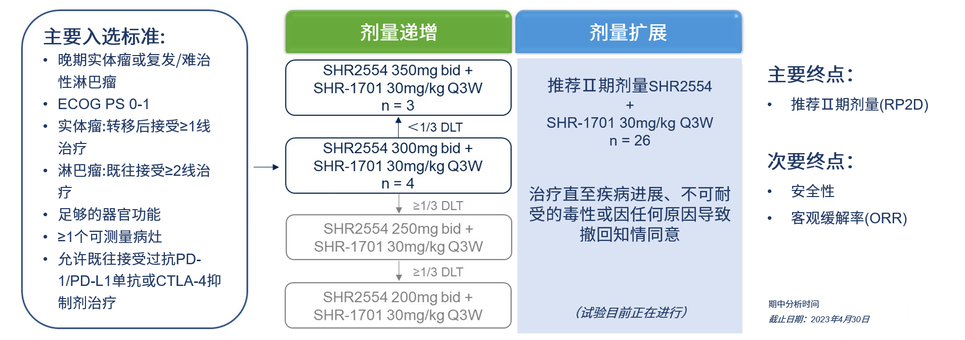 剂量扩展期,给予SHR2554的推荐Ⅱ期剂量(RP2D)加SHR-1701。主要研究终点是RP2D,次要终点是安全性和客观缓解率(ORR)。