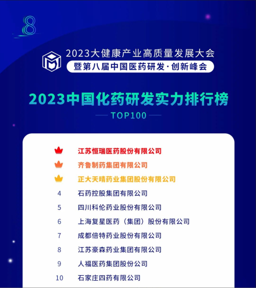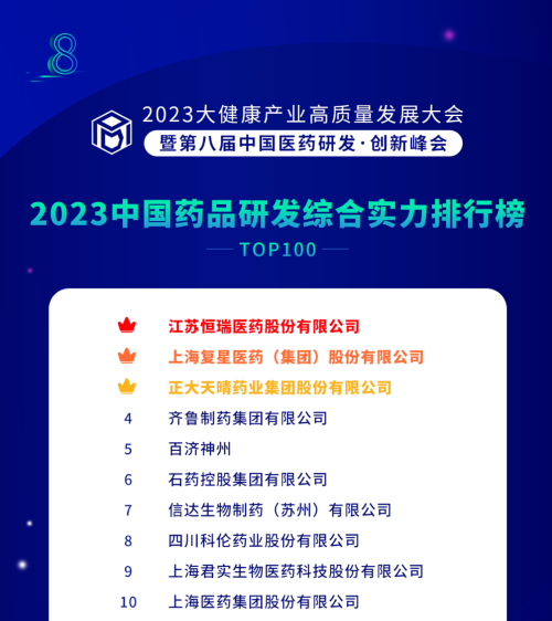 由药智网、中国药业杂志社主办的2023大健康产业高质量开展大会暨第八届中国医药研发•创新峰会于6月16日开幕,会上发布了《2023中国药品研发实力排行榜》系列榜单,K8凯发旗舰医药凭借深厚的创新研发实力再创辉煌:荣登《2023中国药品研发综合实力排行榜TOP100》榜首、《2023中国化药研发实力排行榜TOP100》榜首。值得一提的是,今年是K8凯发旗舰医药陆续在第6年入选《中国药品研发综合实力排行榜》榜首。