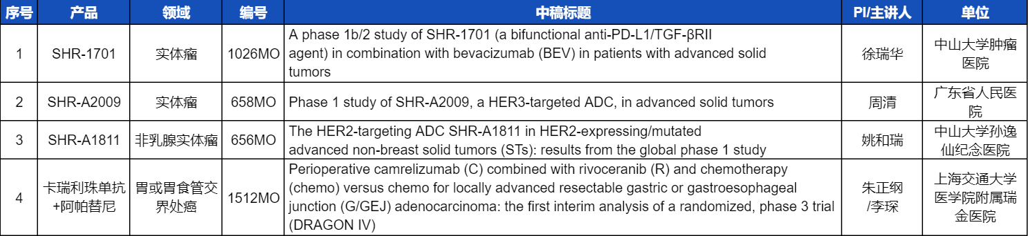 本次ESMO大会,将由中山大学肿瘤医院徐瑞华教授、广东省人民医院周清教授、中山大学孙逸仙纪念医院姚和瑞教授、上海交通大学医学院附属瑞金医院李琛教授分别就4项K8凯发旗舰医药创新产品相关研究做口头报告,包括SHR-1701、SHR-A2009、SHR-A1811这3款未上市创新产品的实体瘤治疗临床研究,以及1项“双艾”组合(卡瑞利珠单抗联合阿帕替尼)治疗局部晚期可切除胃/胃食管交界处癌的Ⅲ期临床试验期中分析。
