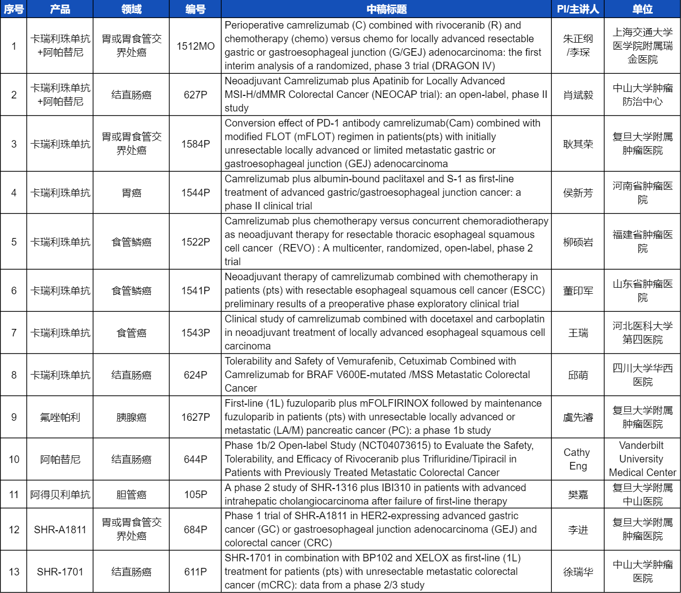 12款抗肿瘤创新药包括6款已上市产品:注射用卡瑞利珠单抗(艾瑞卡®)、甲磺酸阿帕替尼片(艾坦®)、马来酸吡咯替尼片(艾瑞妮®)、阿得贝利单抗注射液(艾瑞利®)、氟唑帕利胶囊(艾瑞颐®)、瑞维鲁胺片(艾瑞恩®),以及6款未上市产品:多靶点受体酪氨酸激酶抑制剂法米替尼、抗PD-L1/TGF-βRII双抗SHR-1701、组蛋白甲基转移酶EZH2抑制剂SHR2554、HER2抗体偶联药物(ADC)SHR-A1811、HER3抗体偶联药物SHR-A2009、新型选择性雌激素受体共价拮抗剂(SERCA)HRS8807等。此次ESMO大会的最新突破摘要(LBA)结果尚未披露,敬请期待!本文特对33项研究成果做了梳理,带领各位读者领略K8凯发旗舰医药创新之光。