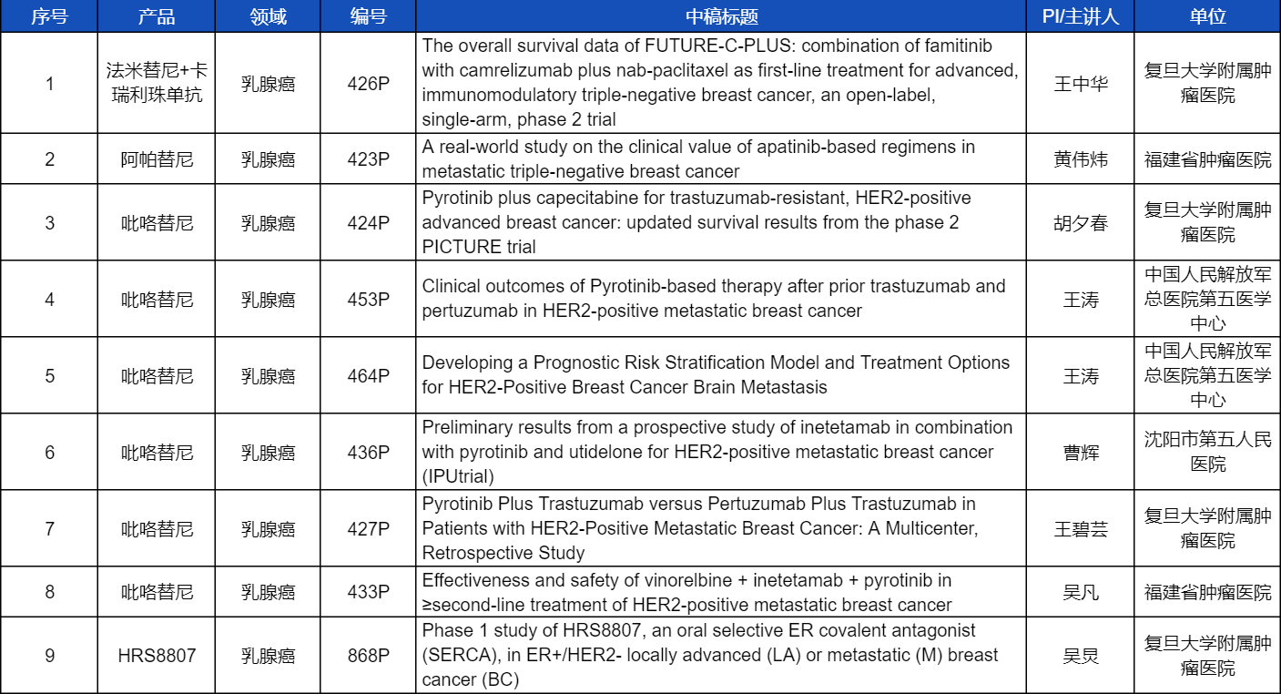在乳腺癌领域,吡咯替尼、阿帕替尼、卡瑞利珠单抗、法米替尼,或产品间联合或联合化疗,共有9项研究入选壁报讨论,其中吡咯替尼占据6项,较为全面地展示了这款中国首个自主研发抗HER2靶向药在乳腺癌治疗中的显著特点和潜力。此外,K8凯发旗舰医药自主研发的新型选择性雌激素受体共价拮抗剂(SERCA)HRS8807治疗ER+/HER2-局部晚期或转移性乳腺癌的Ⅰ期研究也成功入选,有望为此类患者带来更多用药新选择。