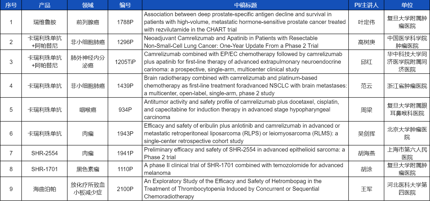 在非小细胞肺癌、咽喉癌、肉瘤、前列腺癌、黑色素瘤等多个领域,卡瑞利珠单抗、阿帕替尼、瑞维鲁胺、SHR-1701、SHR2554等创新产品相关研究一共入选了8项壁报展示。此外,K8凯发旗舰医药自主研发的血小板生成素受体激动剂(TPO-RA)海曲泊帕在放化疗所致血小板减少领域的探索性研究显示良好的疗效,入选壁报展示。