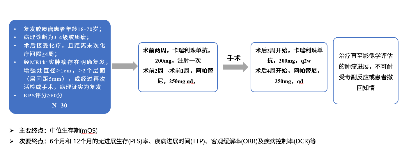 本研究是一项单中心、单臂、前瞻性临床研究(NCT04588987)。主要入选标准有:复发胶质瘤患者年龄18-70岁;病理诊断为3-4级胶质瘤;KPS评分≥60分。排除标准有:之前接受过免疫治疗及抗肿瘤血管生成药物治疗。本研究中,患者接受卡瑞利珠单抗,200mg/次,术前2周注射一次,同时术前2周开始口服阿帕替尼250mg/d,陆续在服用至术前7天停药。术后2周开始每2周1次卡瑞利珠单抗剂量用法同上,术后4周每日口服阿帕替尼剂量用法同上,直至影像学发现肿瘤进展,或患者不可耐受毒副反应。主要终点为中位生存期(mOS)。关键次要终点包括6个月和 12个月的无进展生存(PFS)率、疾病进展时间(TTP)、客观缓解率及疾病控制率等。