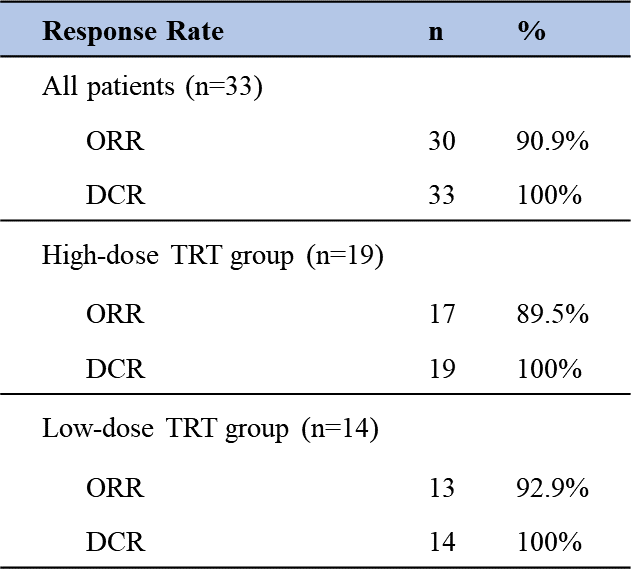 在33例患者中,19例患者接受高剂量TRT(>3Gy*10f或≥2Gy*25f),14例患者接受低剂量TRT(≤3Gy*10f或<2Gy*25f)。阿得贝利单抗联合化疗序贯胸部放疗一线治疗广泛期小细胞肺癌患者显示出良好的数据:ORR达90.9%,这意味着10个ES-SCLC患者中就有9个患者可以取得疾病客观缓解。DCR达100%。根据现在公布的研究数据,接受高剂量TRT组的患者和接受低剂量TRT组的患者疗效上没有显著差异,ORR分别为89.5%和92.9%;DCR都可达100%。