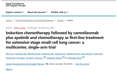 2025年2月18日,广州医科大学附属第一医院钟南山院士团队召开的一项探索诱导化疗联合卡瑞利珠单抗和阿帕替尼(“双艾”组合)治疗广泛期小细胞肺癌(ES-SCLC)的多中心临床研究发表于《自然》子刊、国际知名医学期刊《信号转导与靶向治疗》(Signal Transduction and Targeted Therapy,简称STTT,IF:40.8) [1]。本研究创新性地提出了诱导化疗(EC),即在未经治疗的ES-SCLC患者中,先化疗两个疗程,再联合“双艾”组合,探索性研究其抗肿瘤活性及潜在生物标志物。