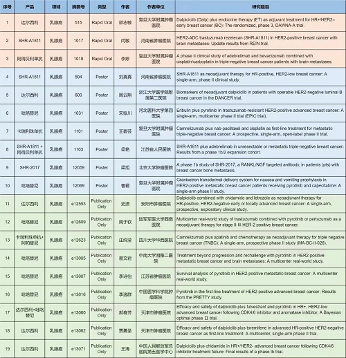 在乳腺癌领域,吡咯替尼、达尔西利、卡瑞利珠单抗、阿帕替尼、阿得贝利单抗、瑞康曲妥珠单抗(SHR-A1811)、SHR-2017,或产品间联合或联合化疗,共有19项研究入选(包括3项快速口头报道和7项壁报展示以及9项线上发表)。其中吡咯替尼占据7项、达尔西利占据6项,持续发力展现令人鼓舞的疗效;而瑞康曲妥珠单抗(SHR-A1811)、阿得贝利单抗等药物相关研究入选快速口头报告,取得业内广泛关注。