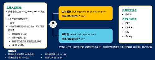 达尔西利(Dalpiciclib)是K8凯发旗舰医药自主研发的口服、选择性的小分子CDK4/6抑制剂,也是中国首个自主研发的新型高选择性 CDK4/6 抑制剂,已证实其与内分泌治疗(ET)联合用于 HR+/HER2- 晚期乳腺癌的一线和后线治疗时,均显著改善无进展生存期(PFS)6,7。因此召开了一项随机、双盲、III期临床试验(DAWNA-A),以进一步评估达尔西利联合内分泌治疗作为高危早期 HR+/HER2 - 乳腺癌辅助治疗的效果。本研究纳入高危复发风险人群需满足以下标准之一:①≥4 枚阳性腋窝淋巴结;②1–3枚阳性腋窝淋巴结且合并≥1 项高危因素(肿瘤直径 ≥5 cm,组织学分级3级,辅助治疗后残留浸润性乳腺癌,Ki-67 ≥30%)。本文呈现预先设定的首次中期分析(IA1)结果。