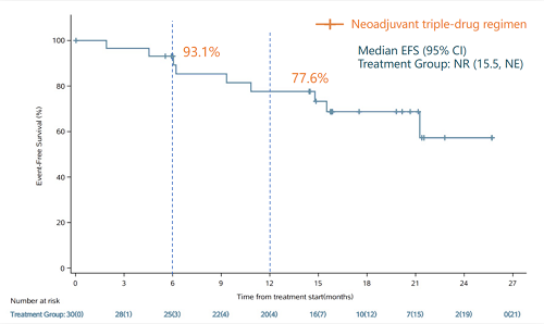 本研究12个月EFS率达77.6%(95% CI:56.7%-89.3%),中位EFS尚未达到。在Ⅱ期患者中,其研究者(INV)评估的中位EFS尚未达到(95% CI:10.8-NE);在Ⅲ期患者中,其INV评估的中位EFS为21.3个月(95% CI:9.3-NE)。
