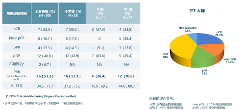在完成手术的28例患者中,16例(57.1%)取得病理学缓解,包括7例(25.0%)实现pCR、5例(17.9%)接近病理完全缓解(near pCR),4例(14.3%)部分病理学缓解(pPR)。其中,12例(42.9%)达到主要病理学缓解(MPR,包括pCR和near pCR)。在Ⅱ期患者中,3例(27.3%)达pCR,1例(9.1%)达pPR,pNR率为63.6%;在Ⅲ期患者中,4例(23.5%)达pCR,5例(29.4%)接近pCR,3例(17.6%)达pPR,pNR率为29.4%。