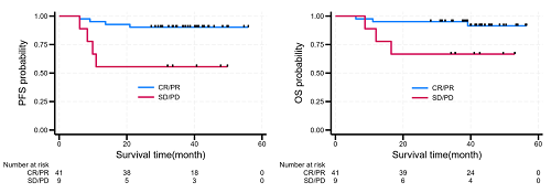 12W时取得完全缓解和部分缓解(CR+PR)的患者,2年PFS率达到90.2%(95% CI:76.1-96.2),12W时疾病稳定和疾病进展(SD+PD)的患者2年PFS率为55.6%(95% CI:20.4-80.5)(P<0.05)。12W时CR+PR患者的2年OS率为95.1%(95% CI:81.9-98.8),12W时SD+PD患者2年OS率为66.7%(95% CI:28.2-87.8)(P<0.05)。