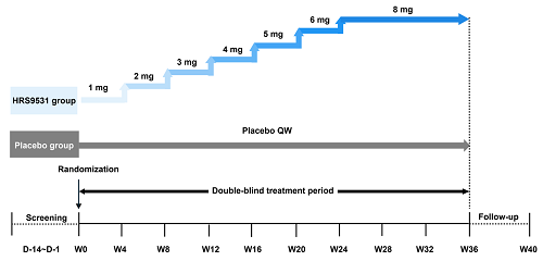 这是一项多中心、随机、双盲、安慰剂对照的Ⅱ期研究(临床试验注册号:NCT06054698)。研究纳入BMI为28.0–40.0 kg/m²,或BMI为24.0–28.0 kg/m²且至少伴有一种体重相关合并症的中国成年参与者,随机分配接受每周一次皮下注射HRS9531(顺利获得剂量滴定方式给药至8 mg)或安慰剂治疗。治疗周期为36周,包括24周剂量递增期和12周8 mg剂量维持期。主要终点是第36周时体重相对基线的百分比变化。